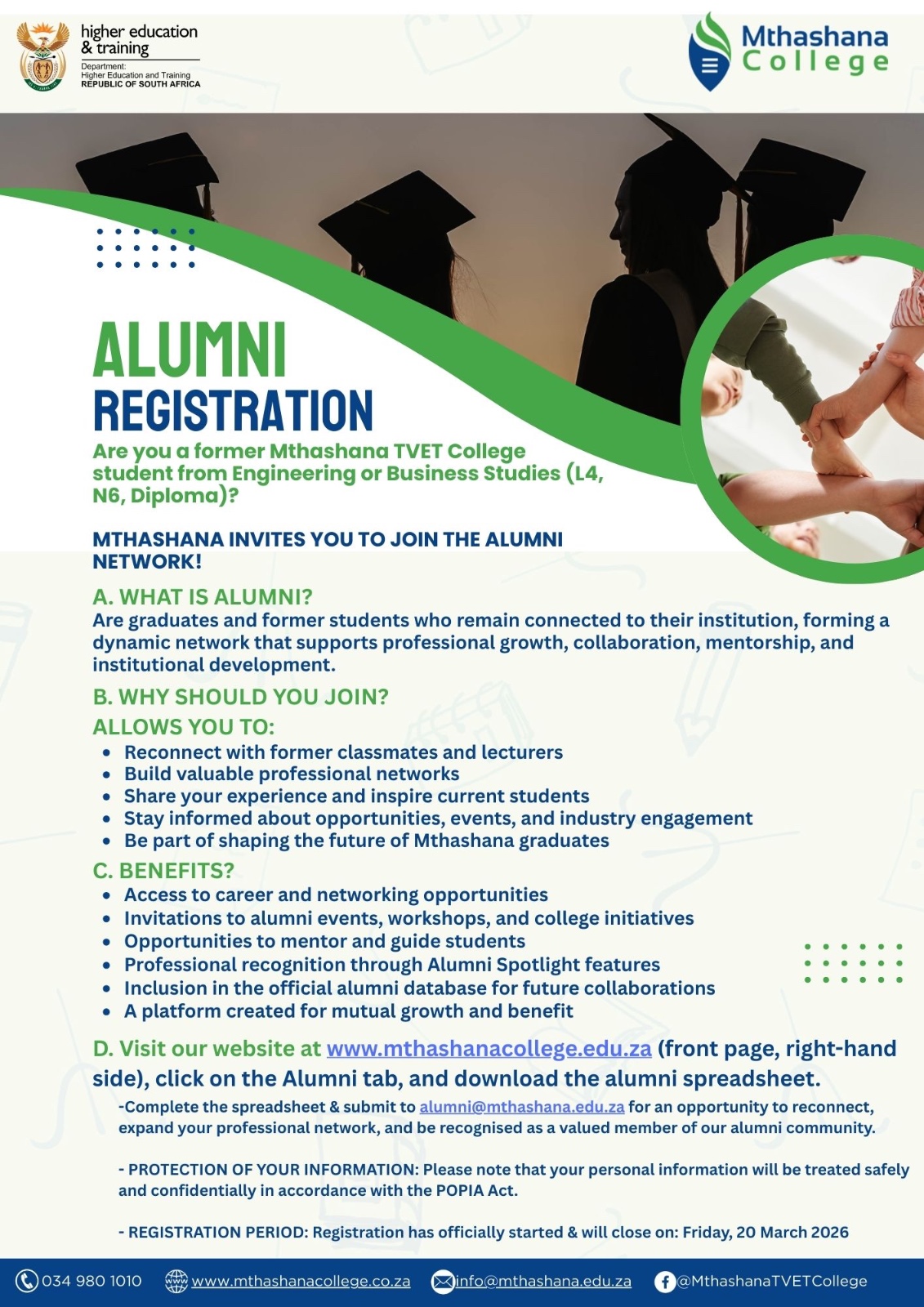 Mthashana TVET College Alumni Network is committed to helping you maintain contact and lifelong relationships with the institution, as well as its nationwide community.  Our aim is to continue to keep you informed, engaged, and inspired.  We provide a range of opportunities for you to stay involved and contribute to the advancement of our Institution.